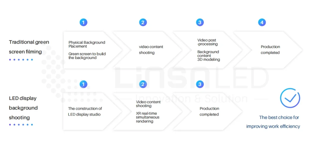 (1) As a self-emitting displaying technology, LED display screens can be the light source itself, while green screen or projection can only play as a background.