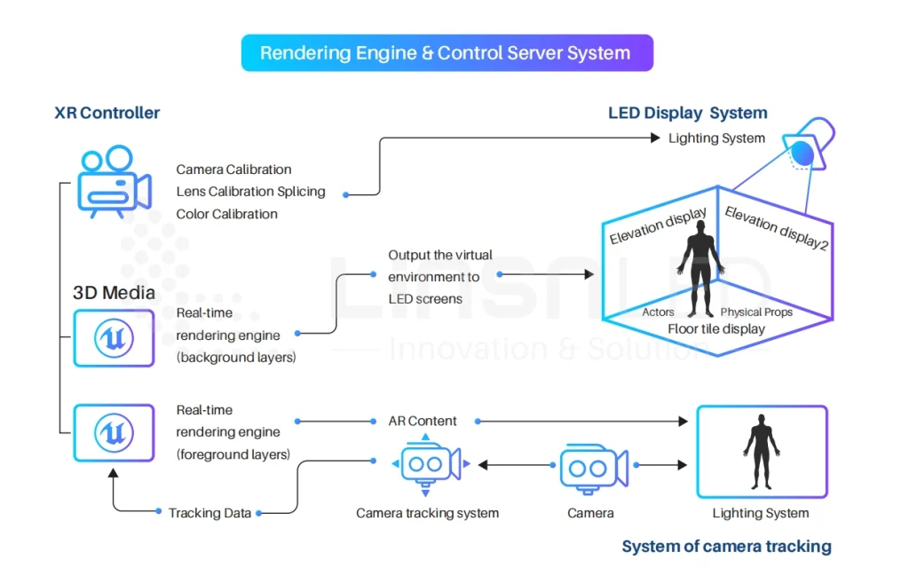 During the filming process, professionals can leverage a combination of XR technology, camera motion tracking, and real-time rendering to produce an immersive, all-encompassing environment on the LED display stage. This generates a 3D visual effect, enabling the desired scene to be rendered directly during filming.